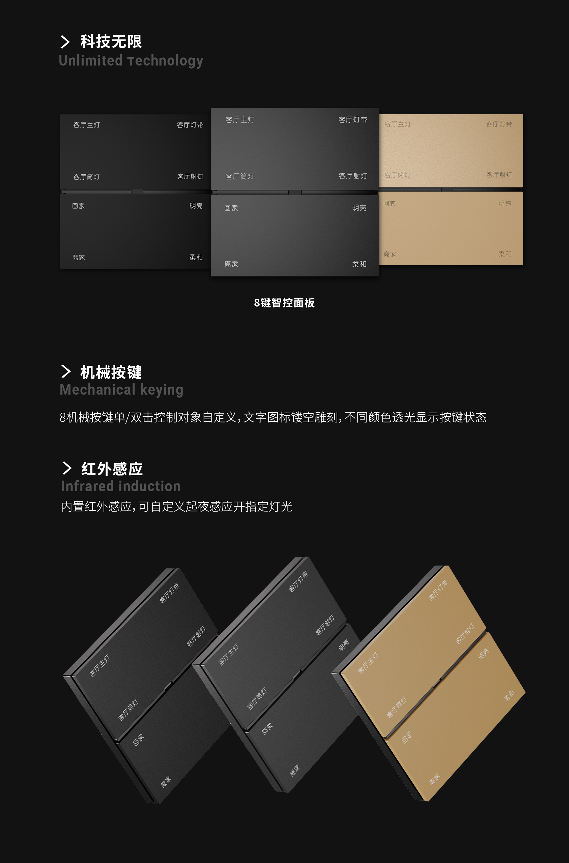 - 按鍵背光:每天三個(gè)自定義時(shí)段自動(dòng)調(diào)節(jié)明暗(臥室面板可設(shè)置睡眠后自動(dòng)關(guān)閉背光)